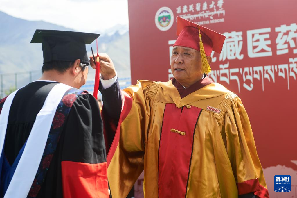6月21日,西藏藏医药大学校长、博士生导师米玛为2023届毕业生拨流苏。新华社记者 旦增尼玛曲珠 摄