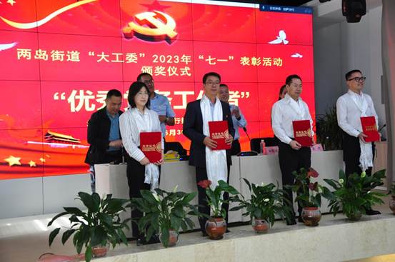 面向党旗宣誓、重温入党誓词、为新发展党员佩戴党徽、宣读表彰决定,分行获得“先进基层党组织”荣誉称号,两岛街道“大工委”兼职委员温颖获得“优秀党务工作者”荣誉称号。来自两岛街道、社区、分行的先进典型代表走上讲台接受表彰,营造了大力学习先进典型,争当先进的浓厚氛围,引导广大党员干部职工见贤思齐、对标先进,进一步锤炼过硬本领和优良作风,以优异成绩践行“学思想、强党性、重实践、建新功”的总要求。