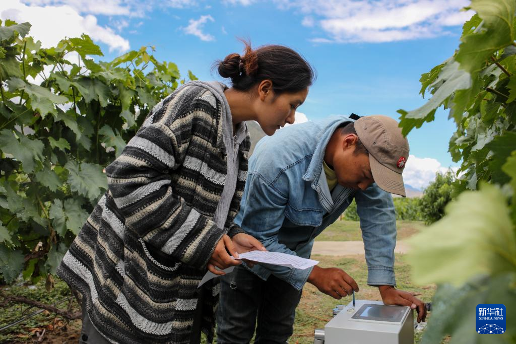 曲珍(左)在葡萄园里向技术员何志荣学习操作光谱仪(7月26日摄)。新华社记者 姜帆 摄