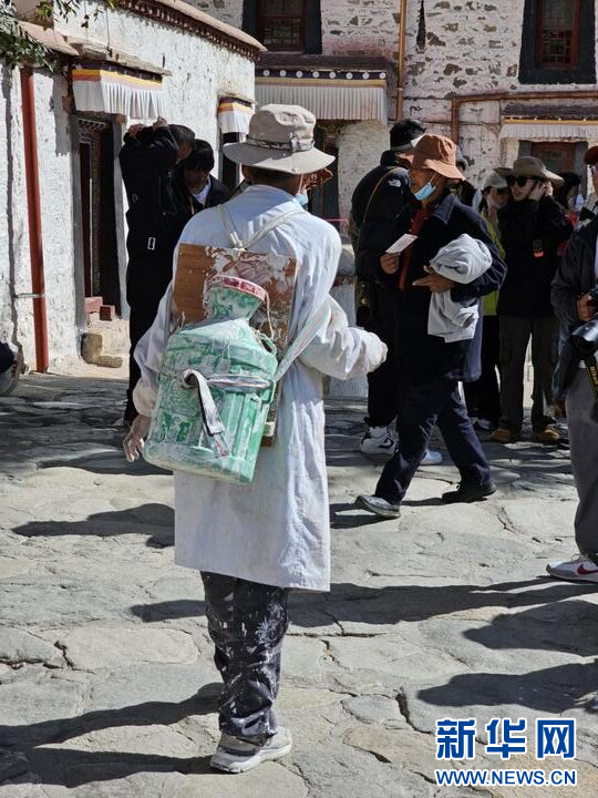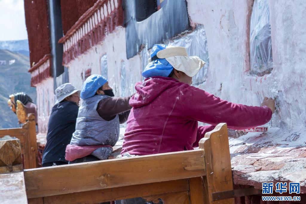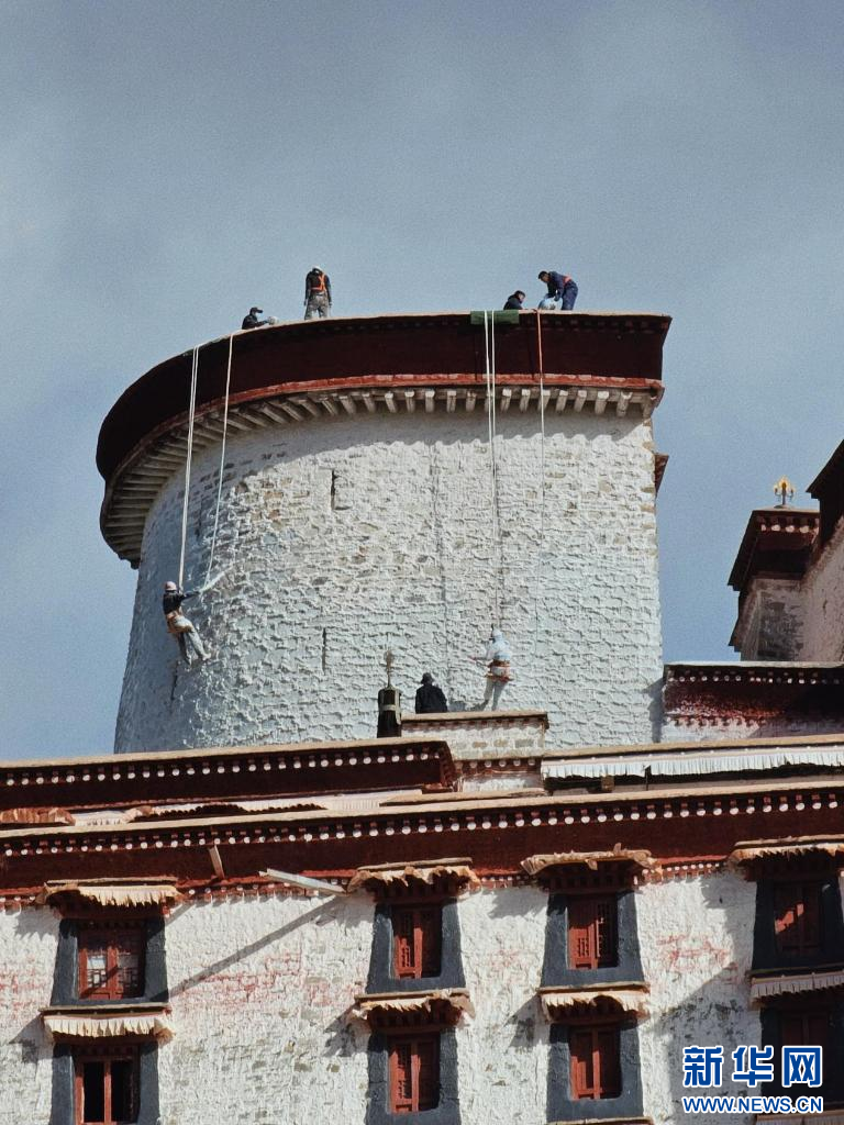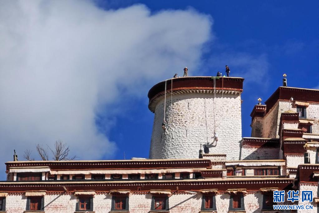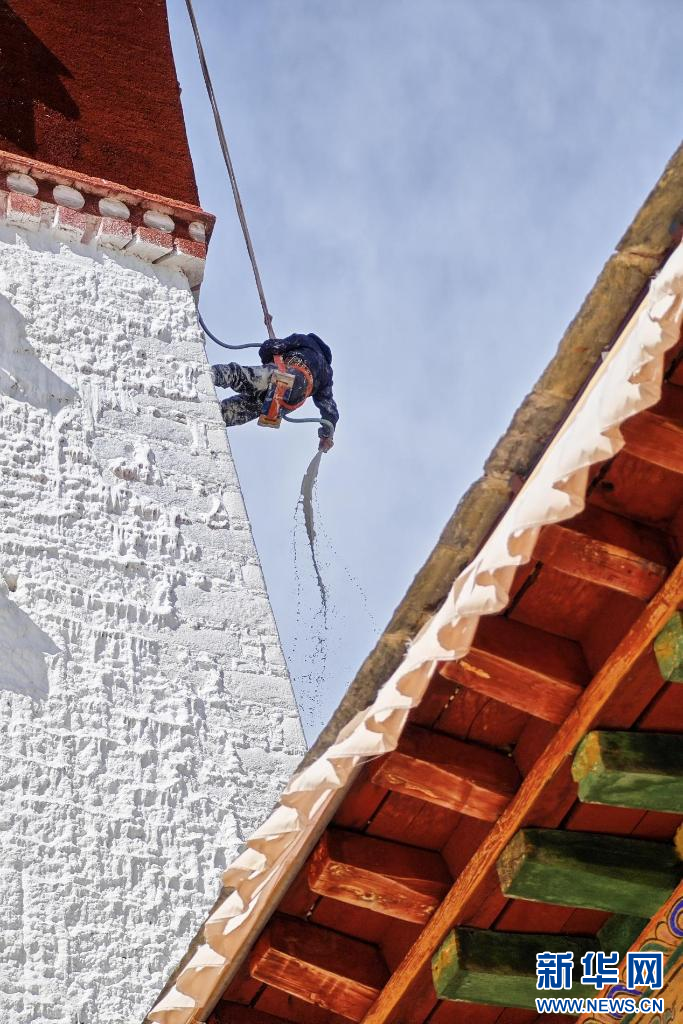 10月18日,布达拉宫“美容师”在喷洒涂料。新华网 柑丹鸯琦 摄