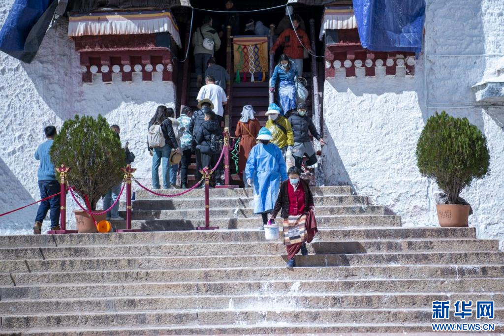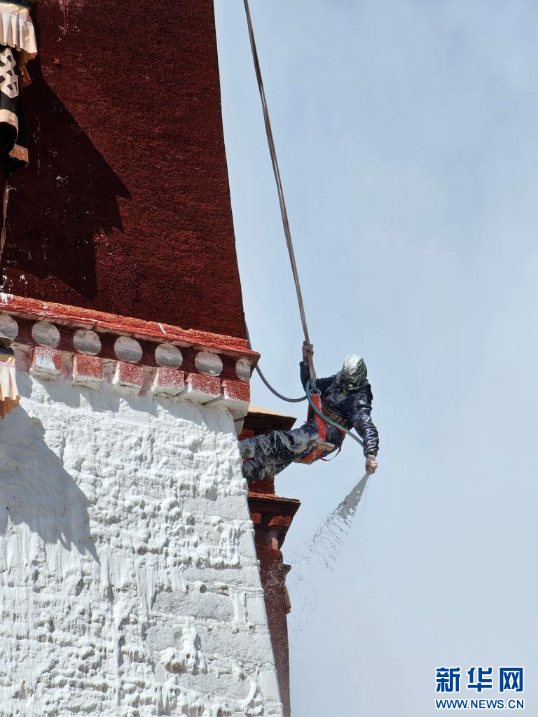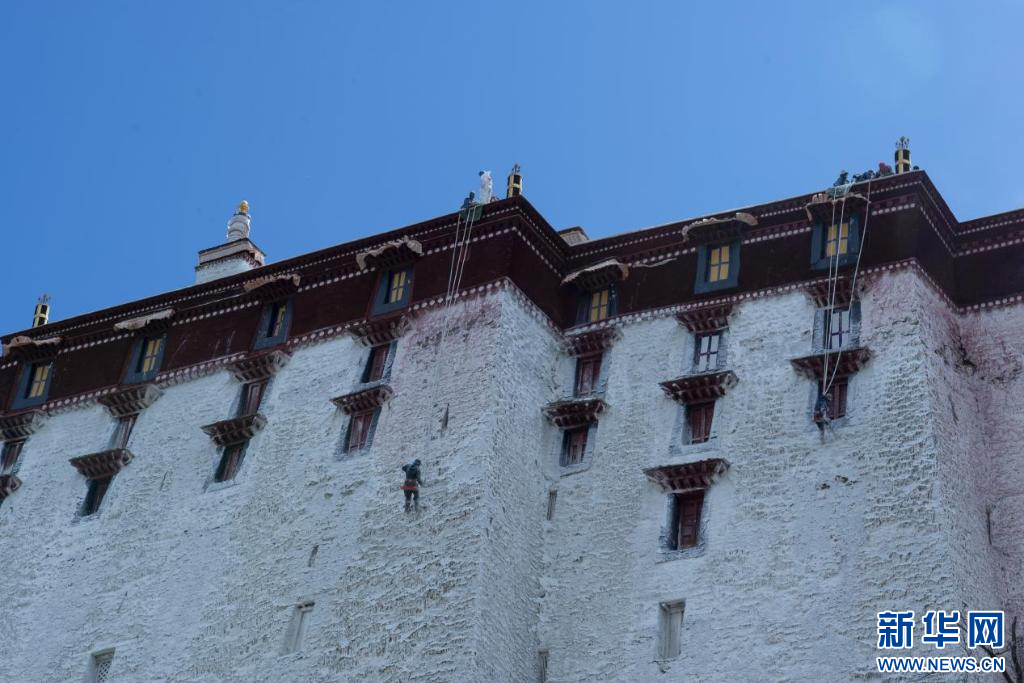 10月18日,布达拉宫“美容师”们在喷洒外墙。新华网 旦增努布 摄