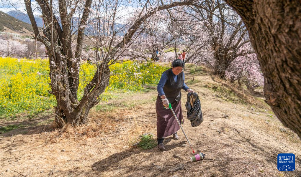 尼玛曲吉在嘎拉村桃花园里捡拾垃圾。新华社记者丁增尼达 摄