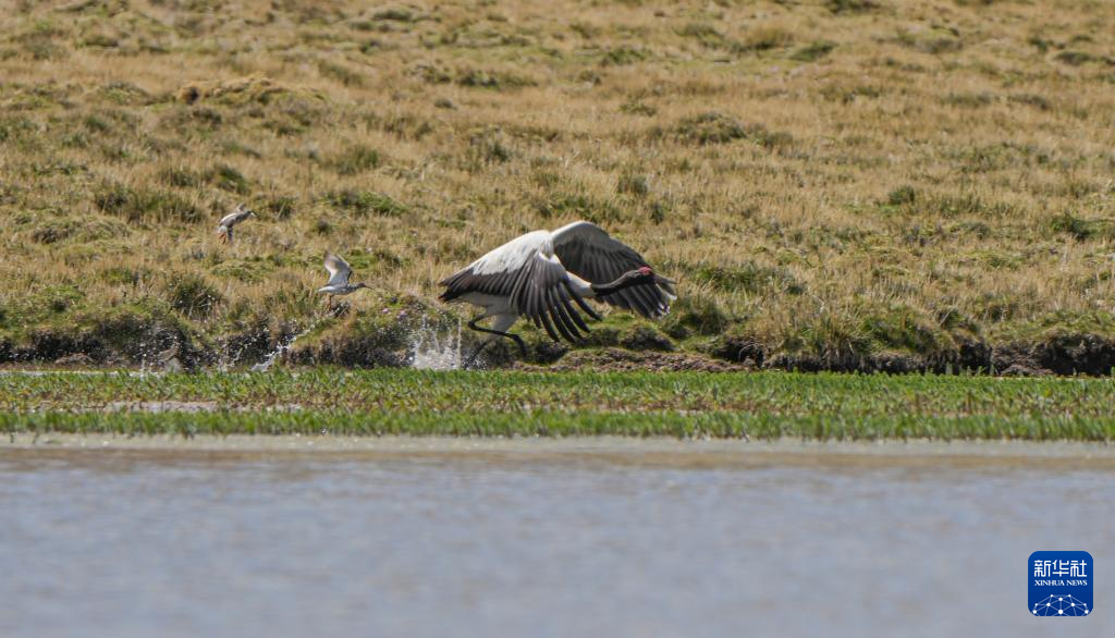 黑颈鹤在湿地飞翔觅食(6月7日摄)。新华社记者 晋美多吉 摄