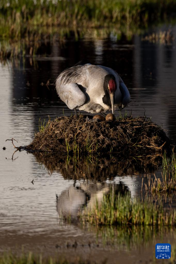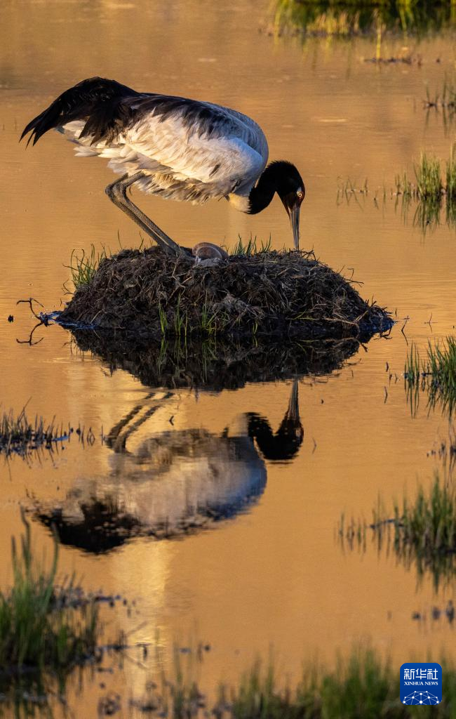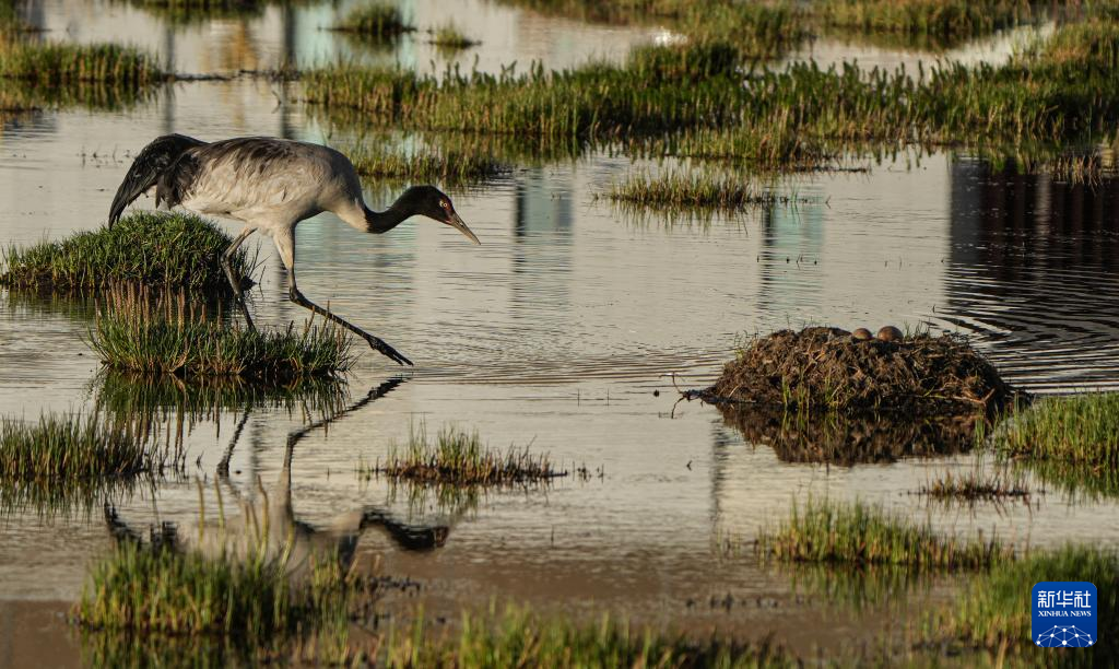 黑颈鹤在湿地孵蛋(6月7日摄)。新华社记者 姜帆 摄