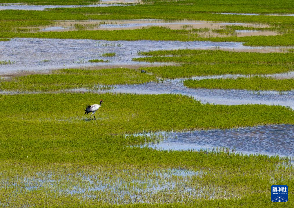 黑颈鹤在湿地觅食(6月8日摄,无人机照片)。新华社记者 姜帆 摄
