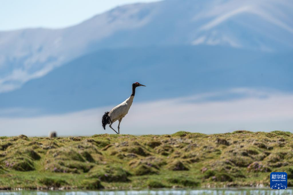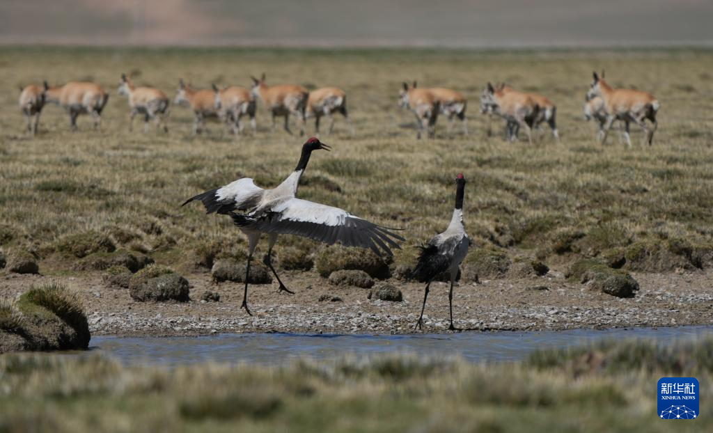 黑颈鹤在湿地和藏羚羊一起觅食(6月8日摄)。新华社记者 晋美多吉 摄