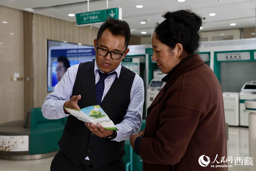 农行洛扎县支行工作人员在向办事群众讲解“个人碳账户”。 人民网记者 次仁罗布摄