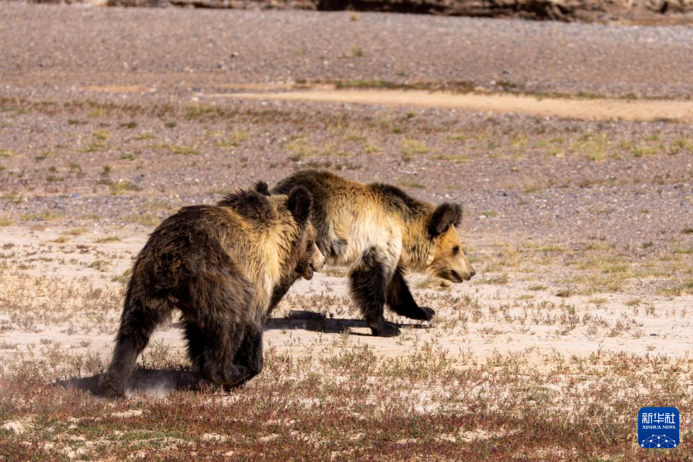 在西藏那曲市尼玛县的羌塘国家级自然保护区核心区,被放归的棕熊母子走向大自然(8月30日摄)。新华社记者 姜帆 摄