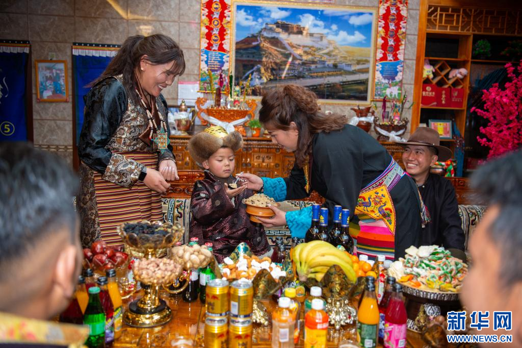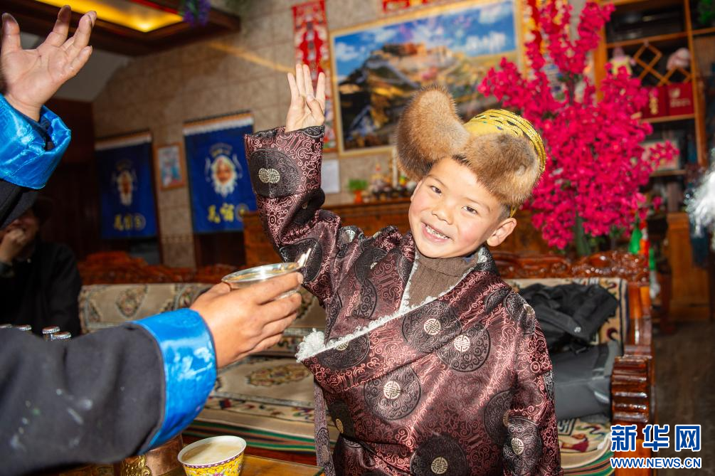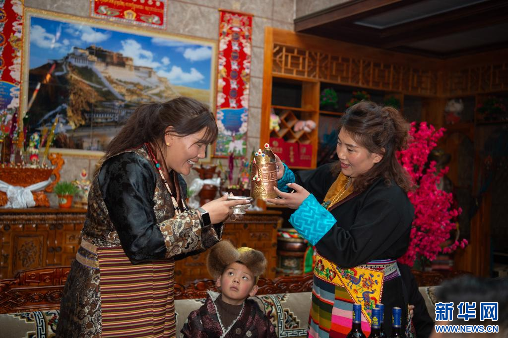 2月28日,小朋友在西藏山南市乃东区扎西曲登社区96号民宿敬献青稞酒。新华网 旦增努布 摄