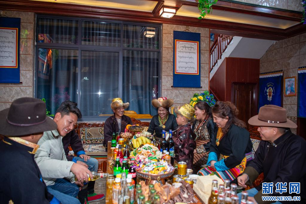 2月28日,西藏山南市乃东区扎西曲登社区群众在喝青稞酒。新华网 旦增努布 摄