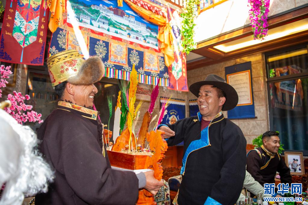2月28日,西藏山南市乃东区扎西曲登社区群众在吃“切玛”(寓意五谷丰登)。新华网 旦增努布 摄