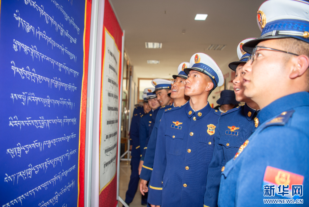 4月9日,西藏森林消防总队消防员在西藏自治区图书馆参观第五届“创意与传承”书法展。新华网 旦增努布 摄