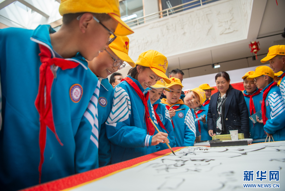 4月9日,拉萨市城关区雪小学学生在西藏自治区图书馆读书活动现场体验书法。新华网 旦增努布 摄