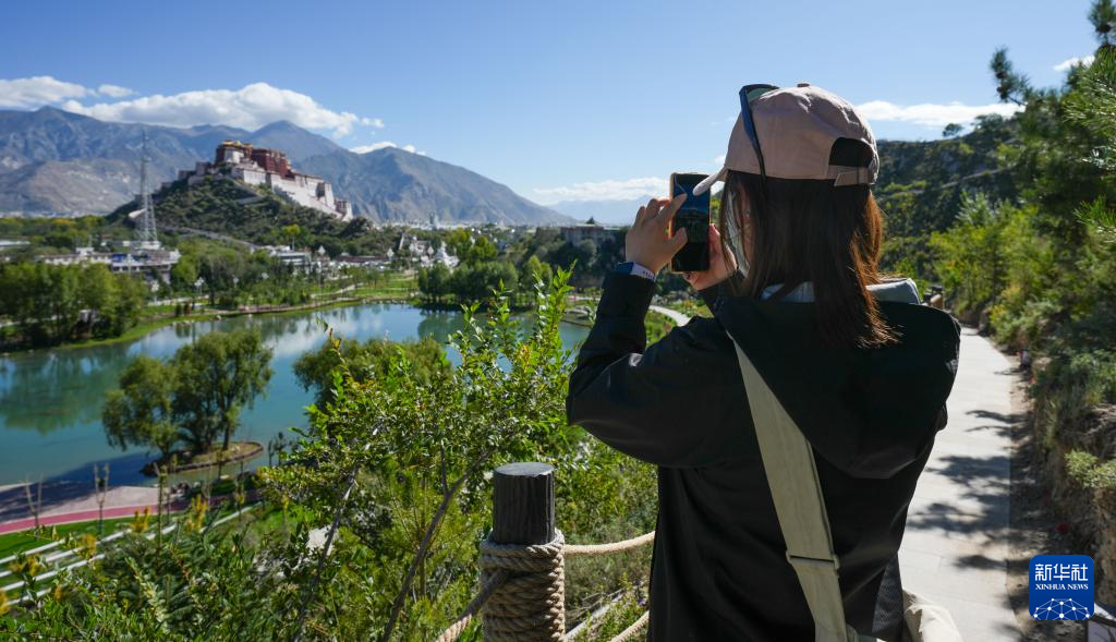 9月25日,在拉萨团结公园旁的药王山步行道上,一名游客拍摄美景。新华社记者 晋美多吉 摄