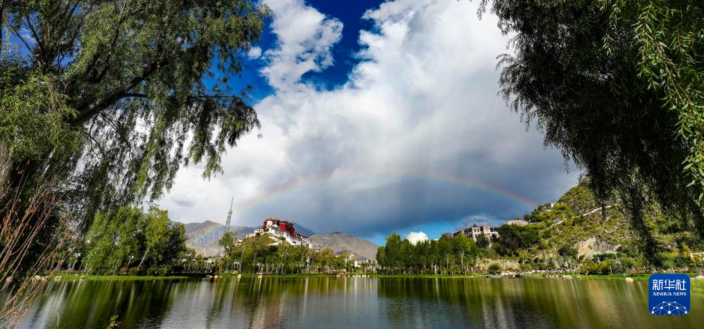 从拉萨团结公园远眺彩虹下的布达拉宫(9月21日摄)。新华社记者 晋美多吉 摄