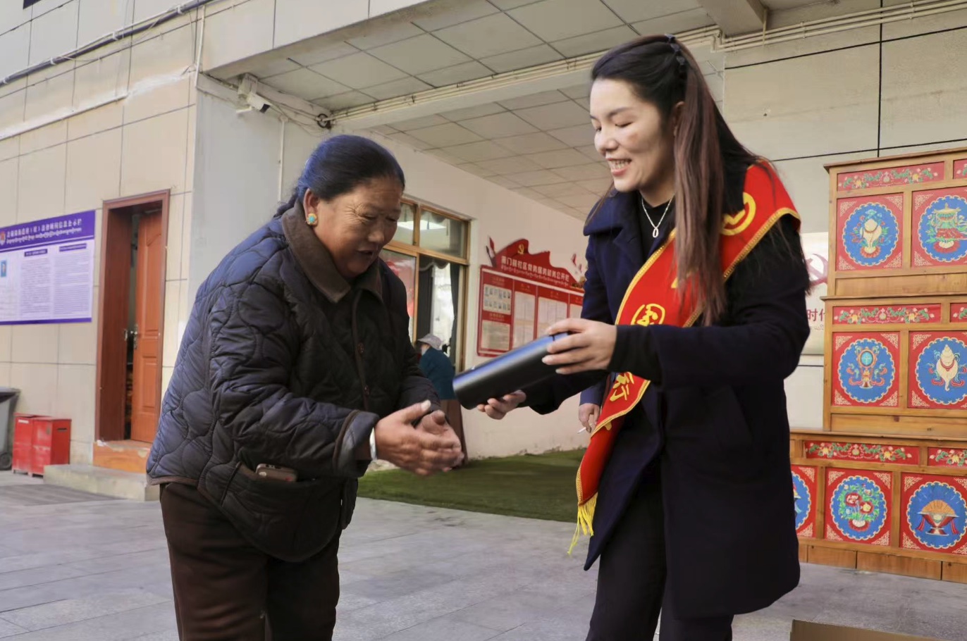 图为中国银行西藏分行工作人员为社区参与活动的居民发奖品。人民网记者次仁罗布摄