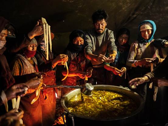 单幅摄影作品《欢聚一堂》定格四川阿坝州藏族村民们前往西藏拉萨途中围炊共餐的动人瞬间。橘色篝火在高原暮色里跃动,映亮传递面条的双手,也映亮彼此含笑的目光,升腾的火焰与民族团结的场景共同诠释了和润之美。