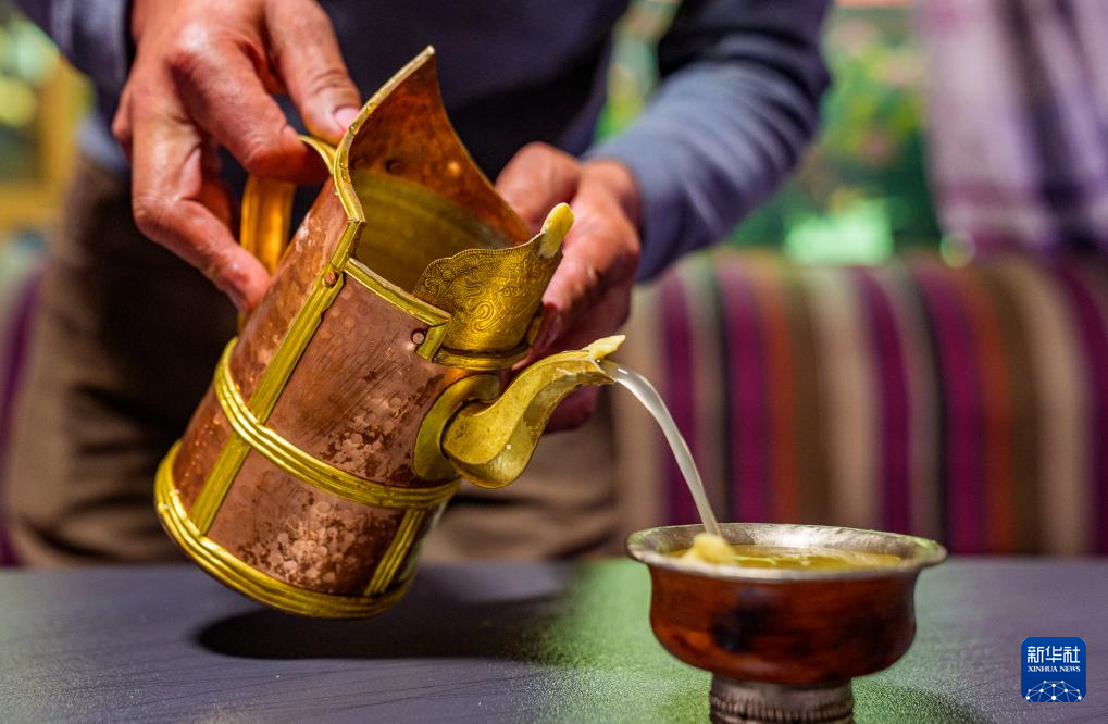 2月16日,在拉萨堆龙德庆区东嘎街道桑木社区,群群在倒青稞酒。新华社记者 丁增尼达 摄