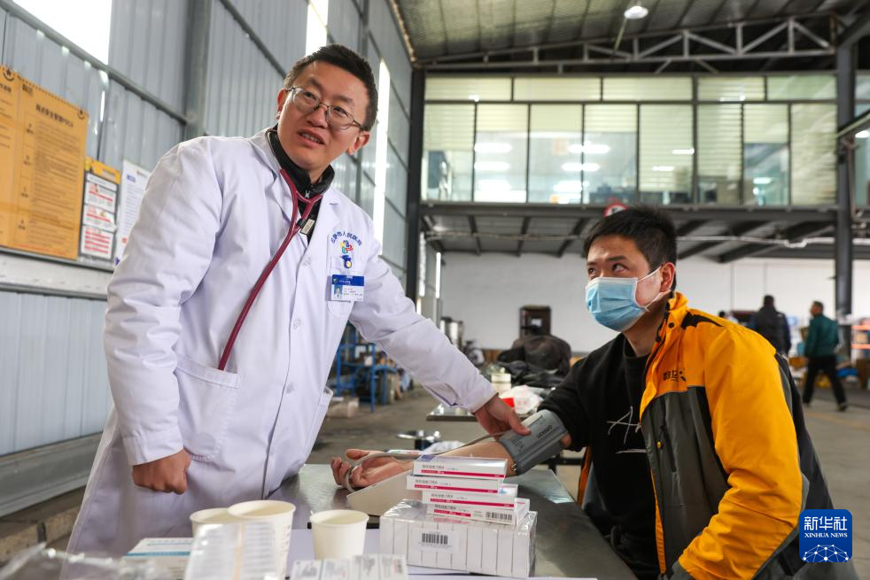 3月13日,来自首都医科大学附属北京安贞医院的心内科专家傅彪(左)为快递从业人员义诊。新华社记者 姜帆 摄