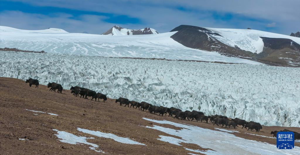 野牦牛群从藏色岗日冰川旁走过(无人机照片,3月10日摄)。新华社发(四郎江村摄)