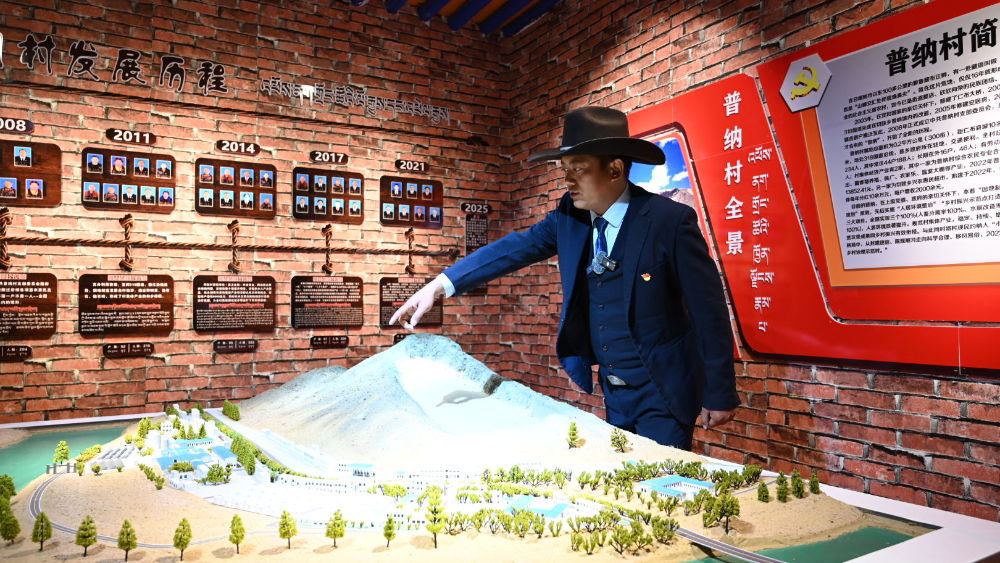 3月23日,拉巴次仁在村史馆介绍普纳村。新华网发 刘蒙青 摄