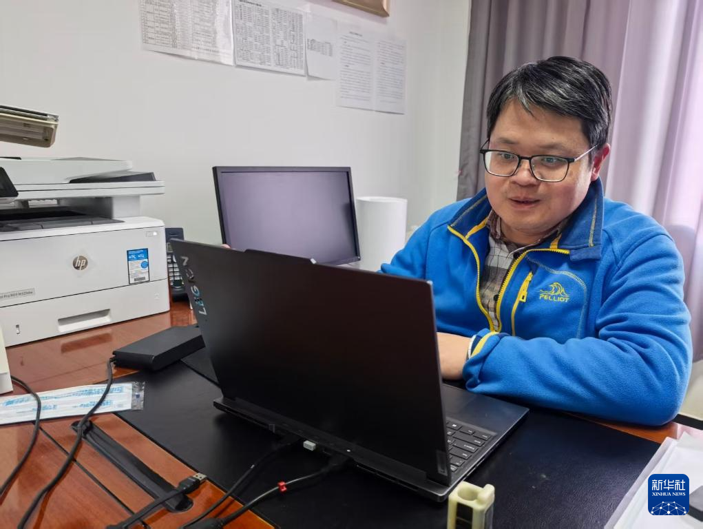 3月30日,杨乐通过黑颈鹤卫星跟踪数据管理系统查看迁徙情况。新华社记者蒋梦辰 摄