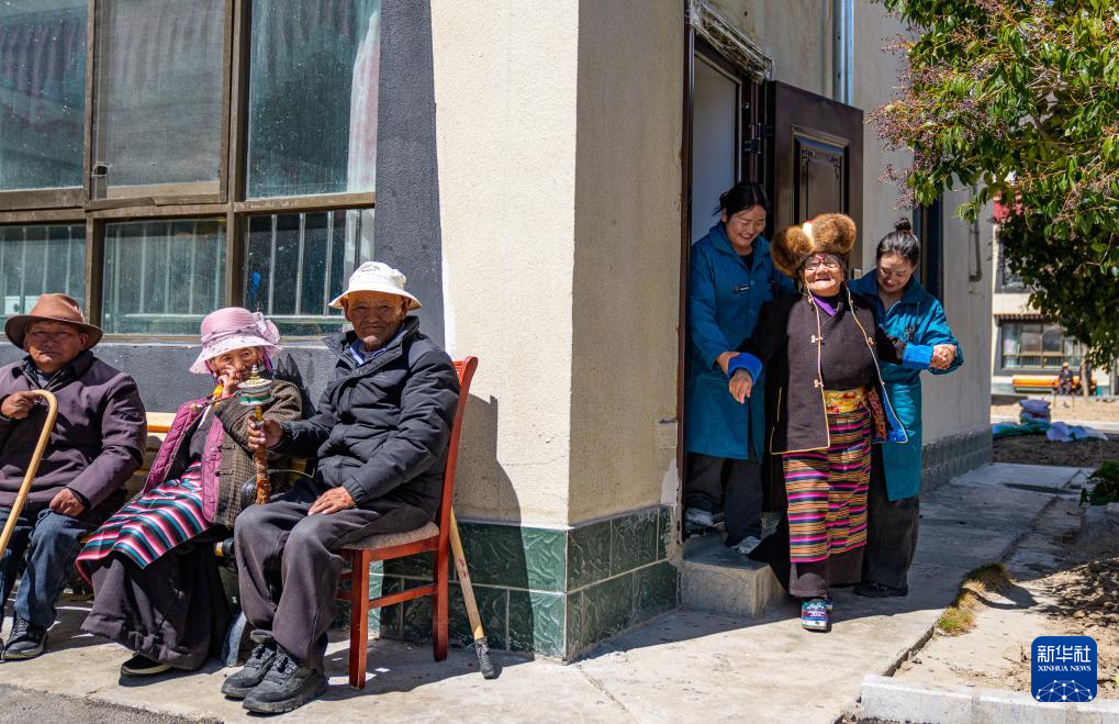 次德吉(右二)和山南市桑日县特困人员集中供养中心工作人员一起去晒太阳(3月25日摄)。